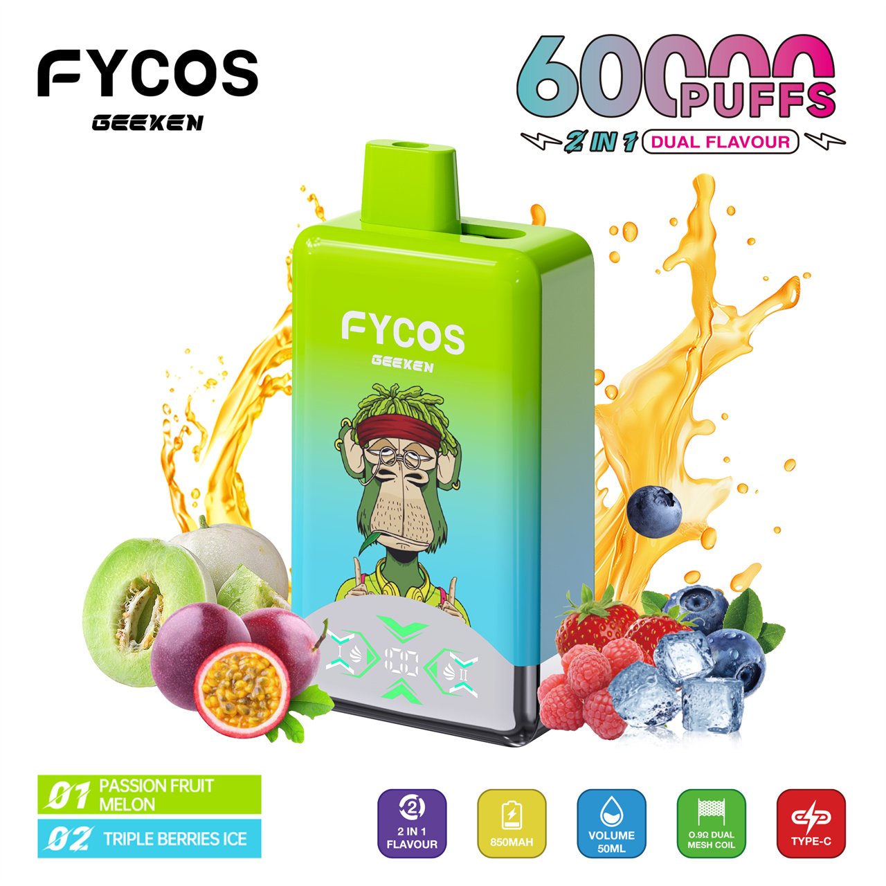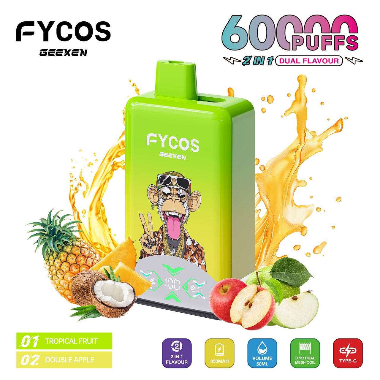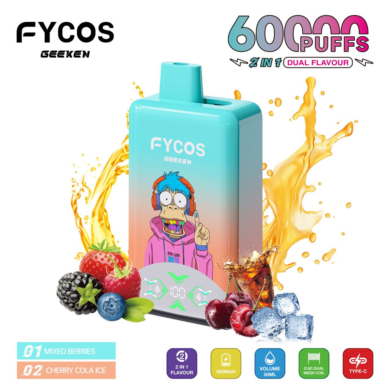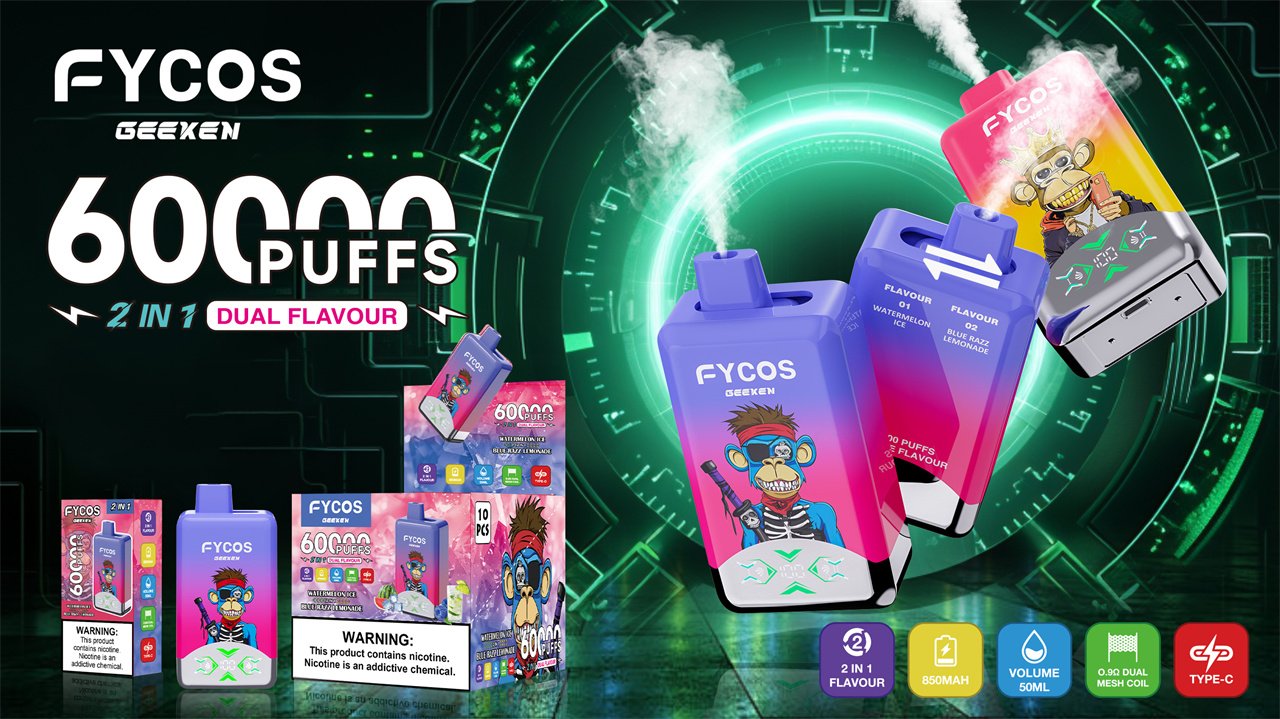 FYCOS 60K Puffs Dual Flavors Disposable Vape features dual-flavor switching, mesh coil technology, rechargeable battery, and smooth long-lasting performance.