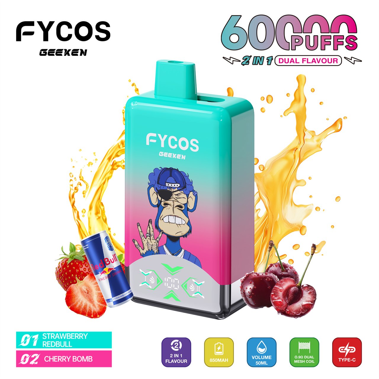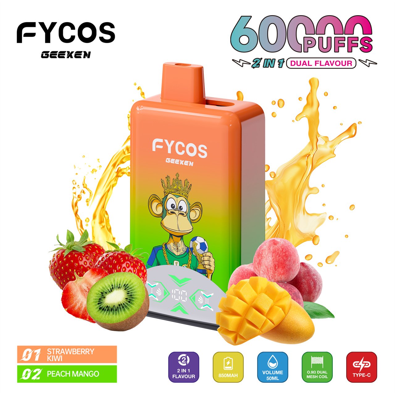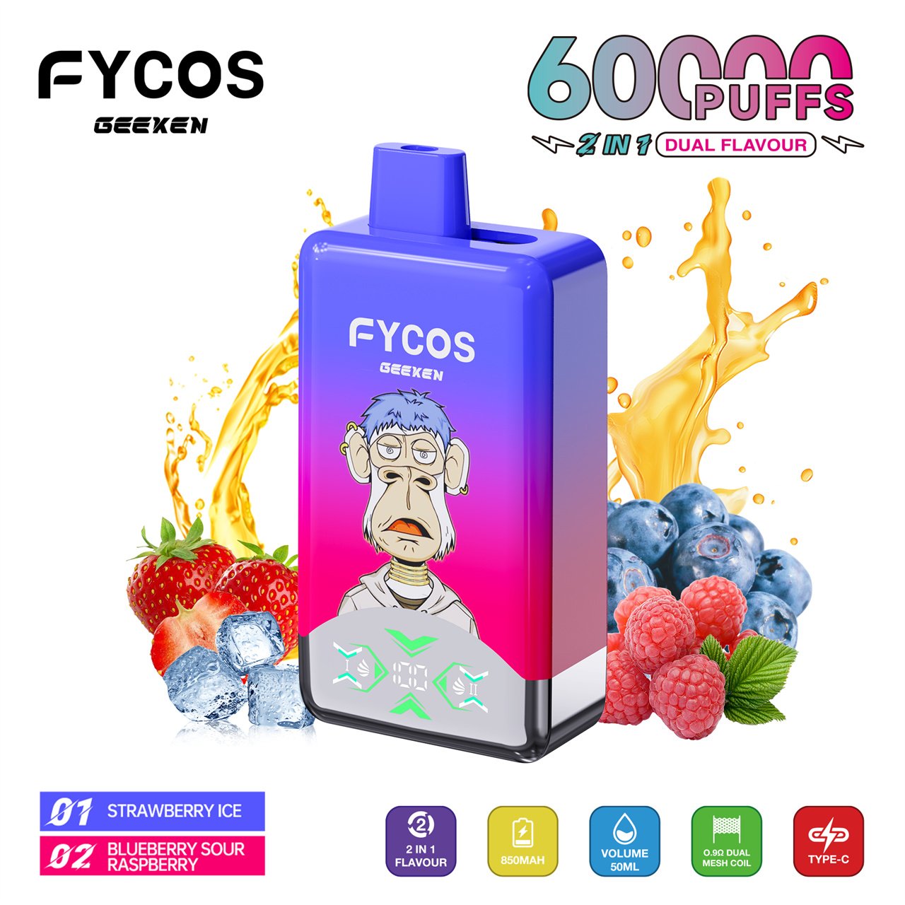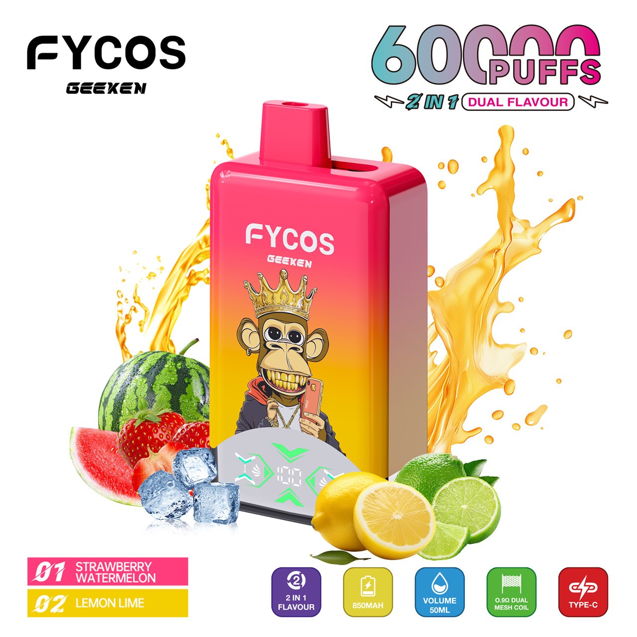 FYCOS 60K Puffs Dual Flavors Disposable Vape features dual-flavor switching, mesh coil technology, rechargeable battery, and smooth long-lasting performance.