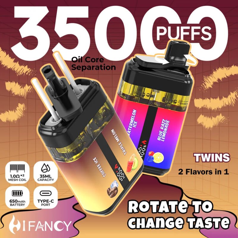 HIFANCY TWINS 35K Puffs Disposable Vape with dual flavor switch, rechargeable battery, and long-lasting performance. Ideal for wholesale vape markets