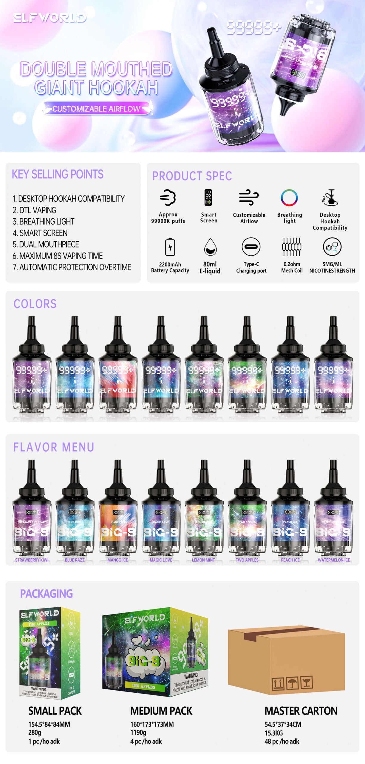 Discover the ELFWORLD Big-B 9999+ Puffs Disposable Vape, featuring a mesh coil, rich flavors, long-lasting battery, and smooth performance. Perfect for wholesale buyers and vapers seeking reliable quality.