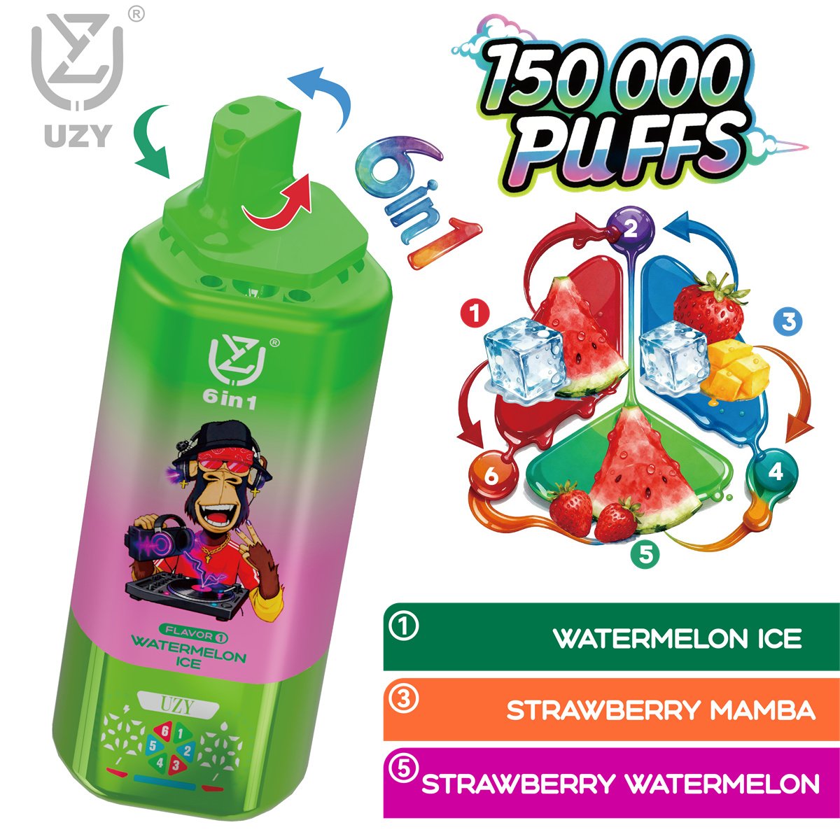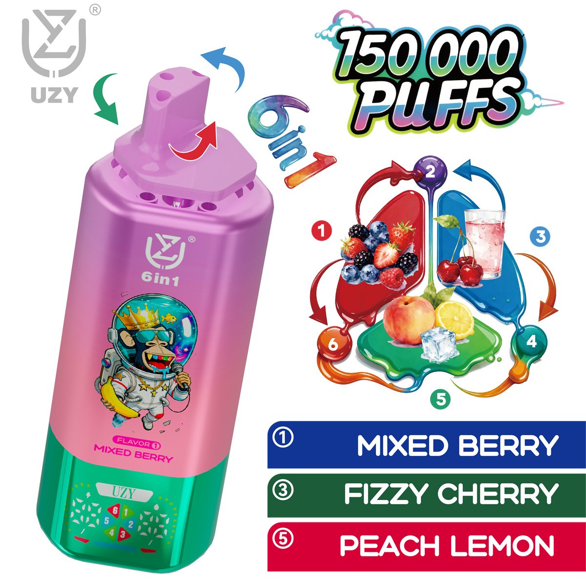 UZY 6 IN 1 150K Disposable Vape – 6 Flavors, Massive Puffs