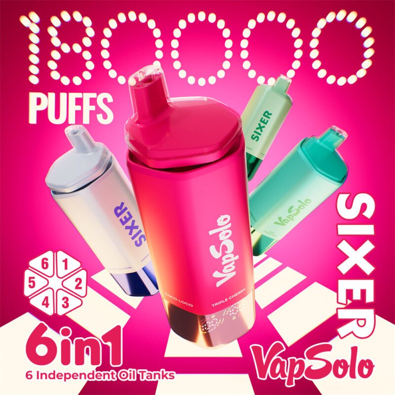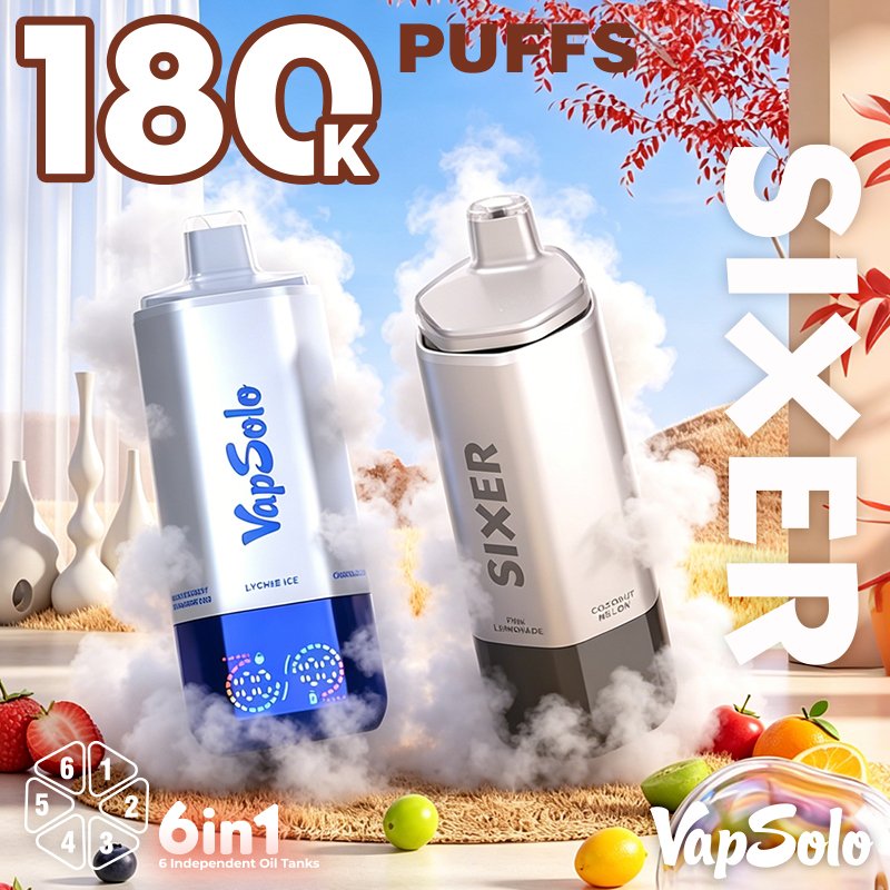 Vapsolo Sixer 180K disposable vape with 180,000 puffs, multi flavor system, rechargeable battery, mesh coil technology. Best high capacity vape for wholesale and retail.