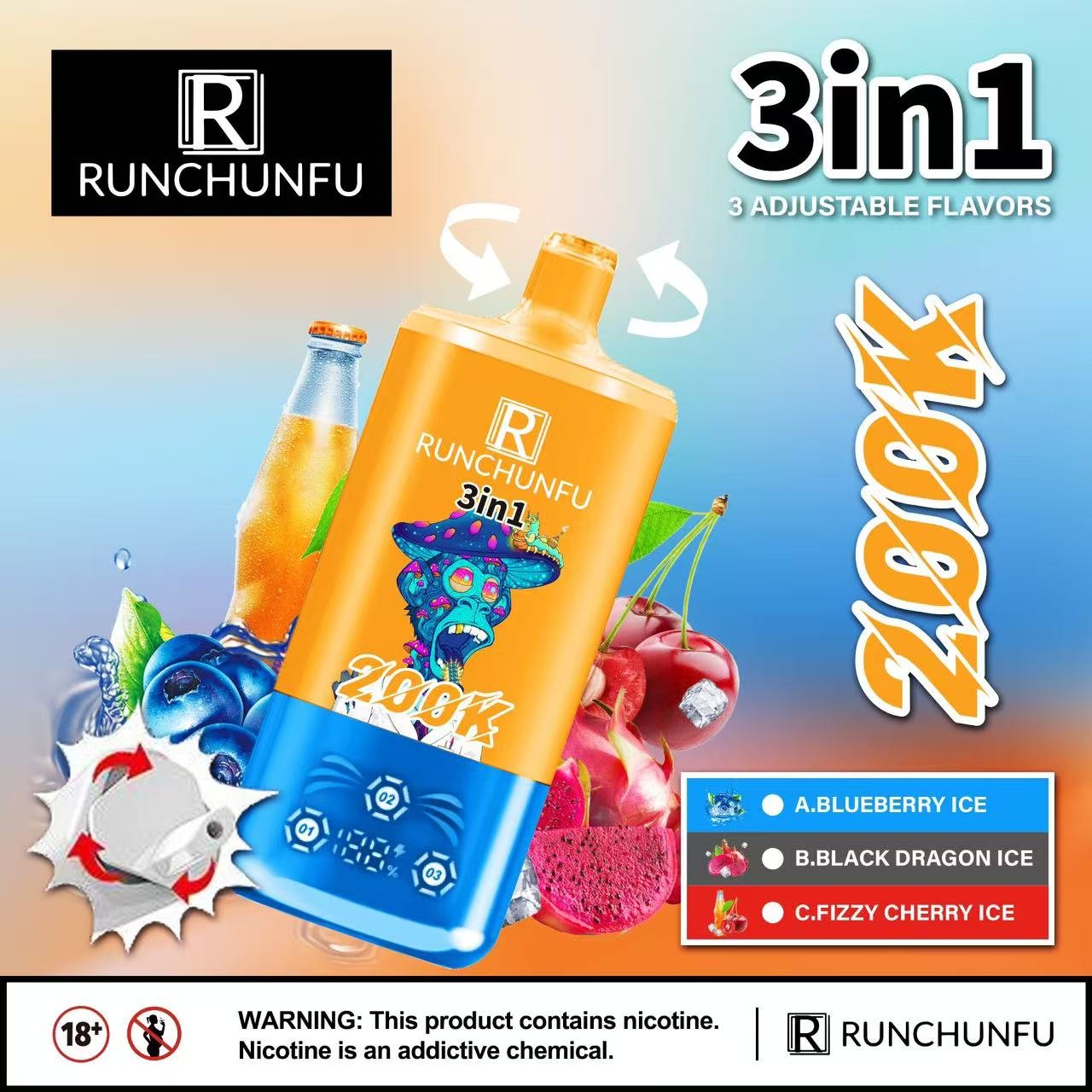 Discover RUNCHUNFU 3 in 1 200K disposable vape featuring 200,000 puffs, three flavors in one device, mesh coil, and smooth long-lasting vapor.